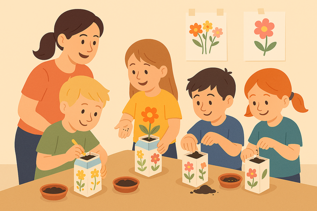 Askarrellaan istutusastia ja istutetaan kukan siemeniä.